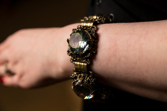 {One might argue that I saved the very best for last, and who would I be to contest that point? This exceedingly rare five piece 1950s multi-colour crystal and gold toned metal suite was nothing short of magnificent! Boasting all of the original components (earrings, necklace, brooch, ring and bracelet), it was the kind of incredible vintage jewelry that one would, no word of a lie, fully expect to see come down the Oscar red carpet on one of Hollywood's finest leading ladies, be they from the fifties or today. It was a honour to wear this suite and feel like nothing short of princess in it - just as I did while wearing all of these incredible pieces of vintage jewelry from Anja's merchandise.}