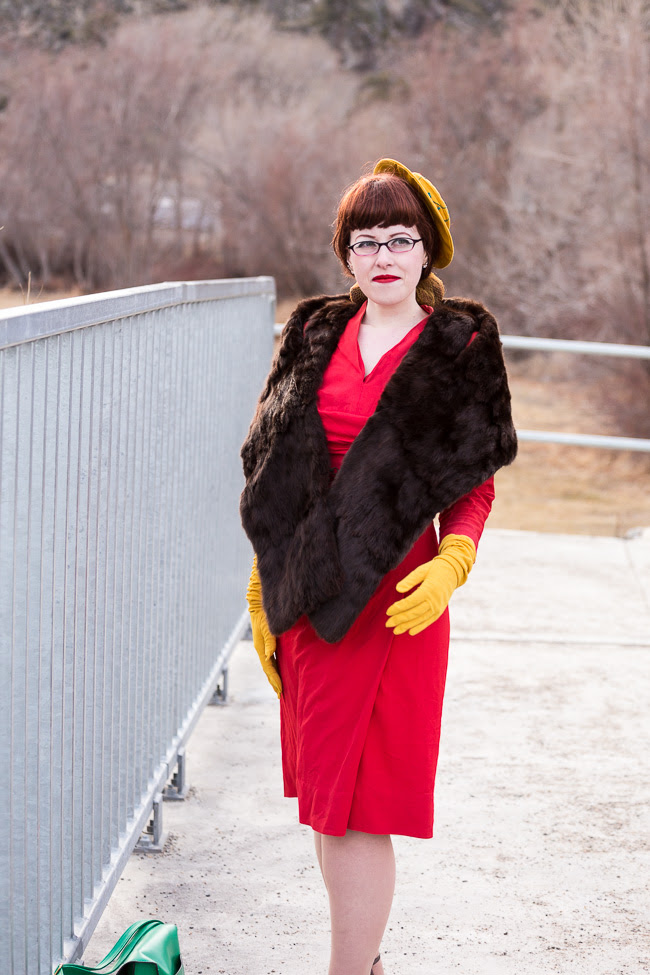A hat this eye-catching and special unto itself already goes a long way towards making an outfit. To help it shine all the more though, I went with a palette of bold, unintentionally traffic light inspired colours, forgoing patterns in favour of the texture that a marvelous 1940s brown fur stole I purchased at last autumn's annual Rutland Antiques & Collectibles Show delivered to my wardrobe for the very reasonable price of $30 (it was in mint condition when I bought it, despite its age, and still is after many wearing throughout this chilly winter).