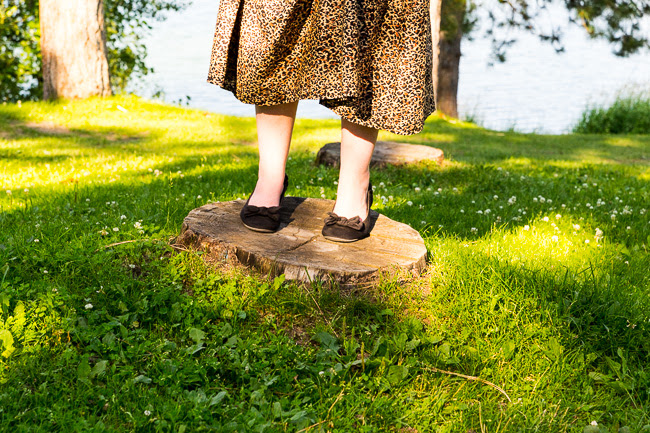 On this day, I partnered my beloved 1950s leopard print circle skirt (from UK reproduction seller Big Barbara Brown, who, and please don't quote me here as I can't say for certain, may have shut down, as their online shop is gone and their Facebook page hasn't been updated in a few months) with a thin, breathable red cotton stretch top, my favourite belt I've ever owned (by a long shot), which looks decidedly mid-century, but is in fact a budget-friendly Forever 21 piece bought several years ago in Toronto, sling back black flats, a few fun hair flowers, and lightweight jewelry. That's it, folks.