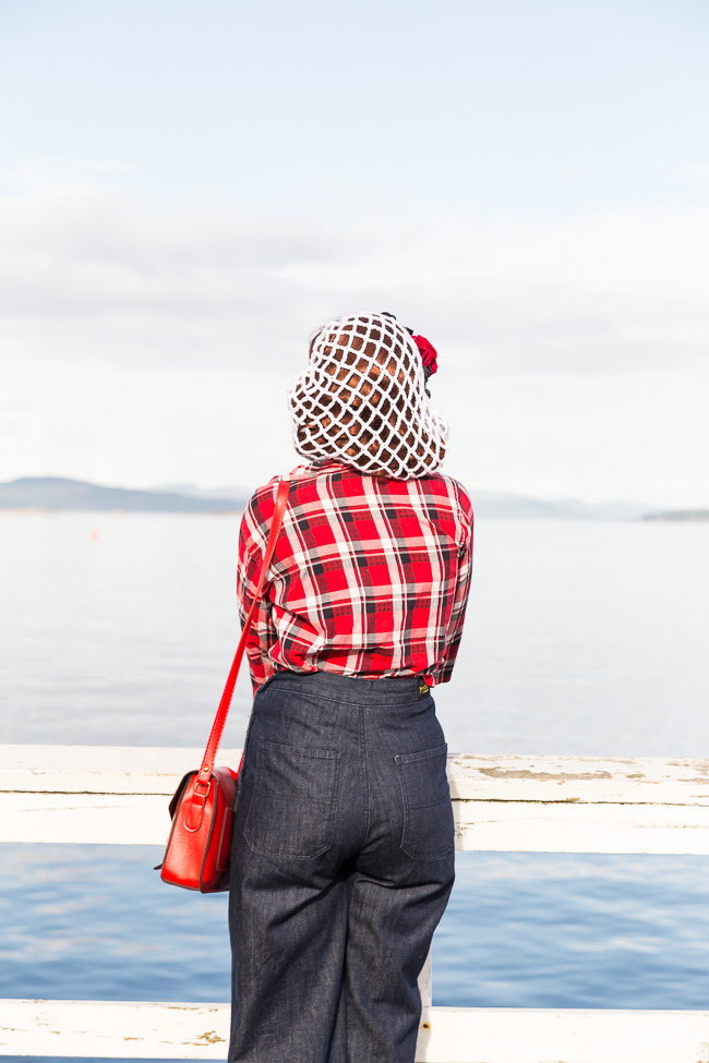 For a day of fun second hand shopping, sightseeing, and driving, I sported my trusty Freddies of Pinewood 1940s style side buttons jeans, a delightful 1950s cropped waist plaid shirt (if I could clone this shirt in a hundred other patterns and colours, I would in the quickest of heartbeats), a snood that I received as a gift from a dear friend last year, three hair flowers, an assortment of plastic and metal bangles, and an anchor shaped vintage brooch to tie into the nautical-ness of our location.