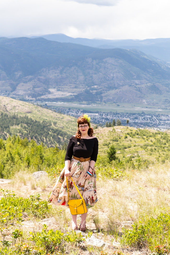 Time was not on our side on the busy day when Tony and I quickly grabbed these shots up Carmi Mountain here in Penticton, so hence the harsh sunlight (aka, we couldn't shot earlier or later in the day, when it would have been kinder and more flattering), epic squinting and weird faces at work here, but again, I simply could not go any long without sharing this skirt with all of you. It is a dream come true for a proud, patriotic vintage loving canuck like myself and I simply had to shout about it from the highest rooftop - or in this case, Mountain peak! :)