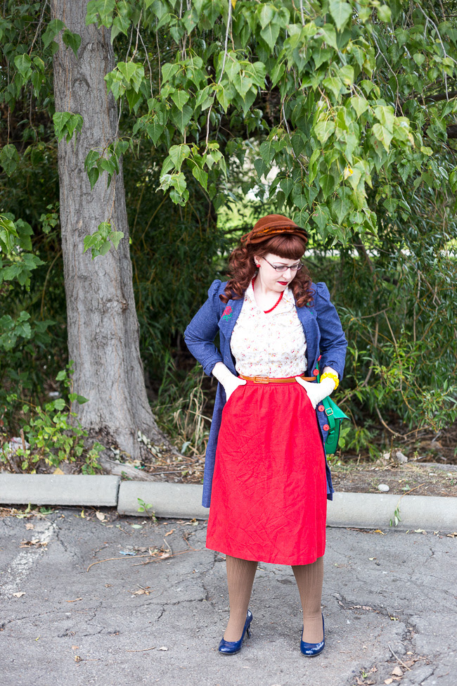 There's a fair bit of colour going on in this outfit, but I grounded it all by using brown throughout my look (hat, belt, tights) and really liked how everything came together here. I might not have dreamed up this exact 1940s inspired look were it not for Emily's great vintage fall fashion contest, so I thank her all the more that she suggested us judges try our hand at creating a look (to help inspire participants with their own styling - we're obviously not taking part in the contest as judges ourselves :)).